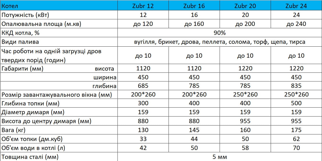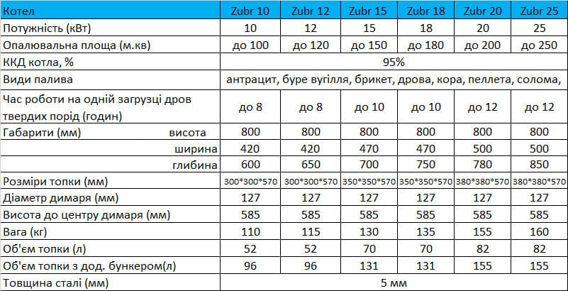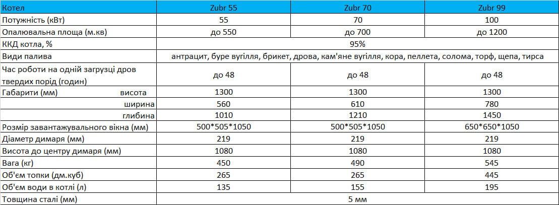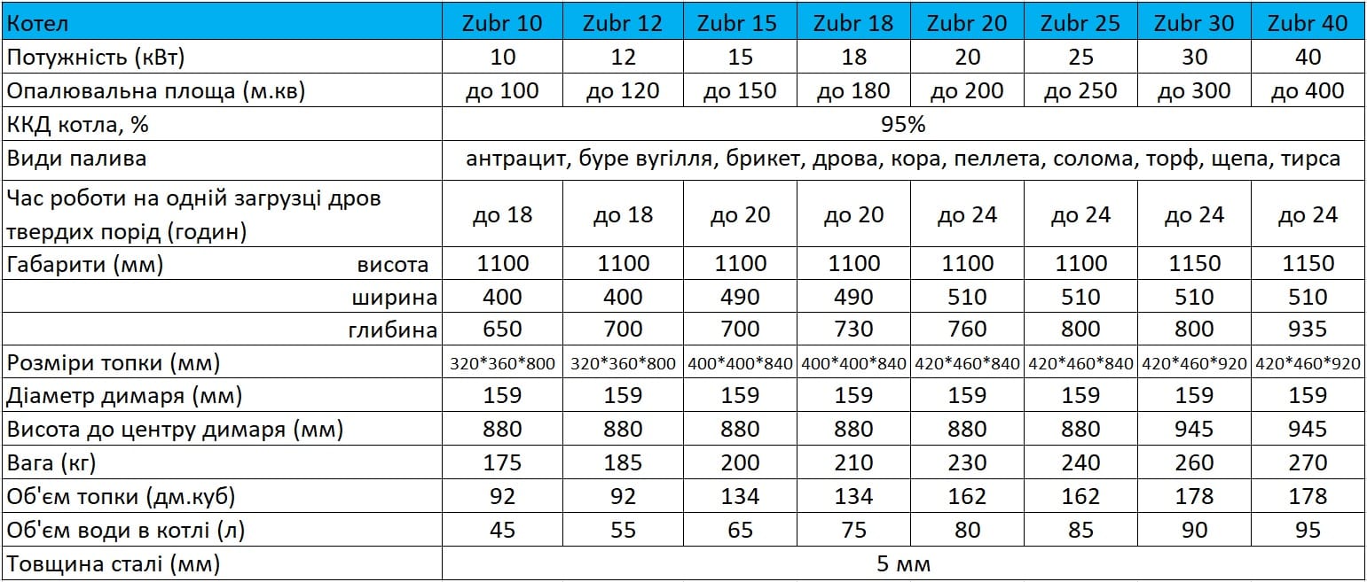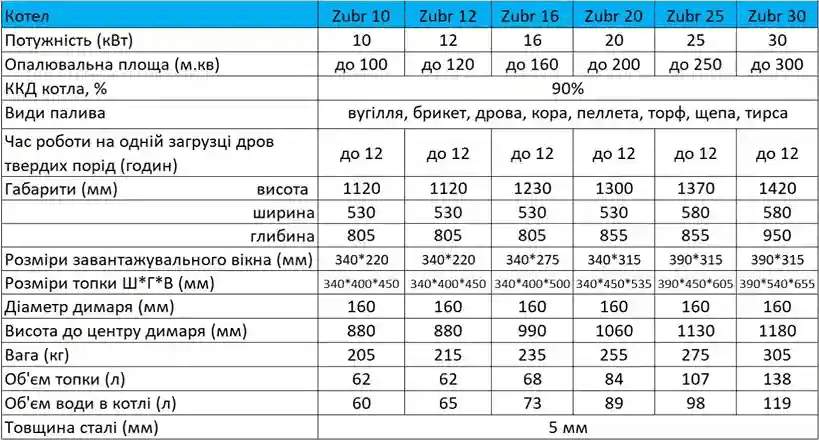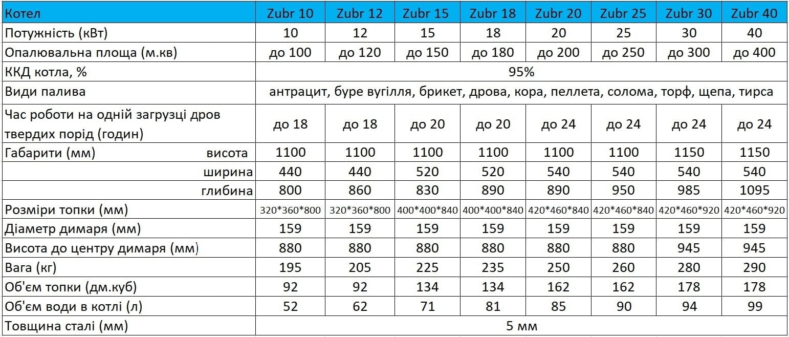 Котли Zubr Termo поєднують у собі довговічність, простоту експлуатації та можливість роботи на різних видах палива: дровах, вугіллі, брикетах. Це оптимальне рішення для підприємств, що цінують економію ресурсів та безперебійну роботу системи опалення.