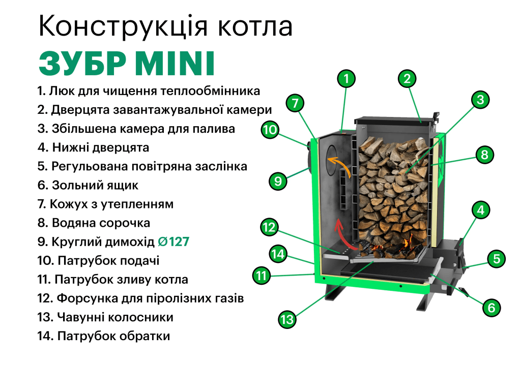 Економічні шахтні котли Zubr Mini — компактне та доступне рішення для ефективного опалення невеликих будинків, дач і господарських приміщень. Завдяки шахтній конструкції забезпечується тривале горіння палива, рівномірний розподіл тепла та високий ККД навіть за мінімальних витрат. Серія Mini поєднує простоту використання, економічність і надійність, залишаючись оптимальним вибором для тих, хто хоче отримати стабільне тепло без зайвих витрат. Котли працюють на дровах, вугіллі та брикетах, легко обслуговуються та мають довгий термін служби.