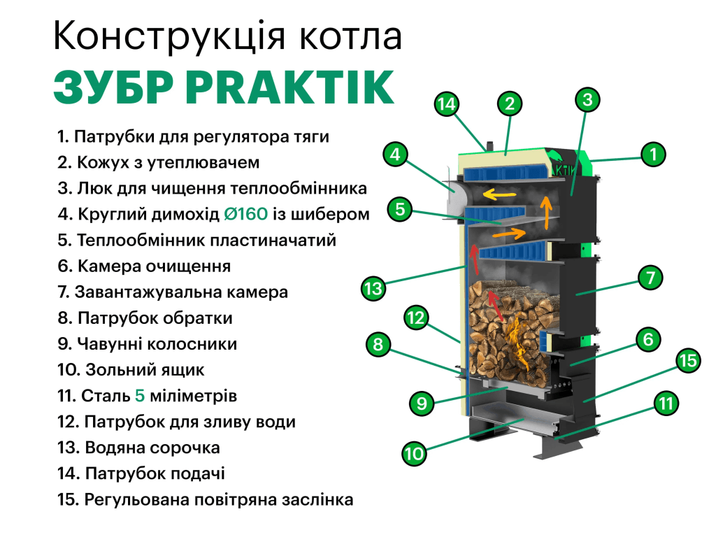 Котли тривалого горіння Zubr Praktik — це надійні та високоефективні опалювальні системи, створені для максимально тривалого процесу горіння без частого завантаження палива. Завдяки продуманій конструкції котли забезпечують стабільне тепло та економію ресурсів, працюючи на дровах, вугіллі та брикетах.