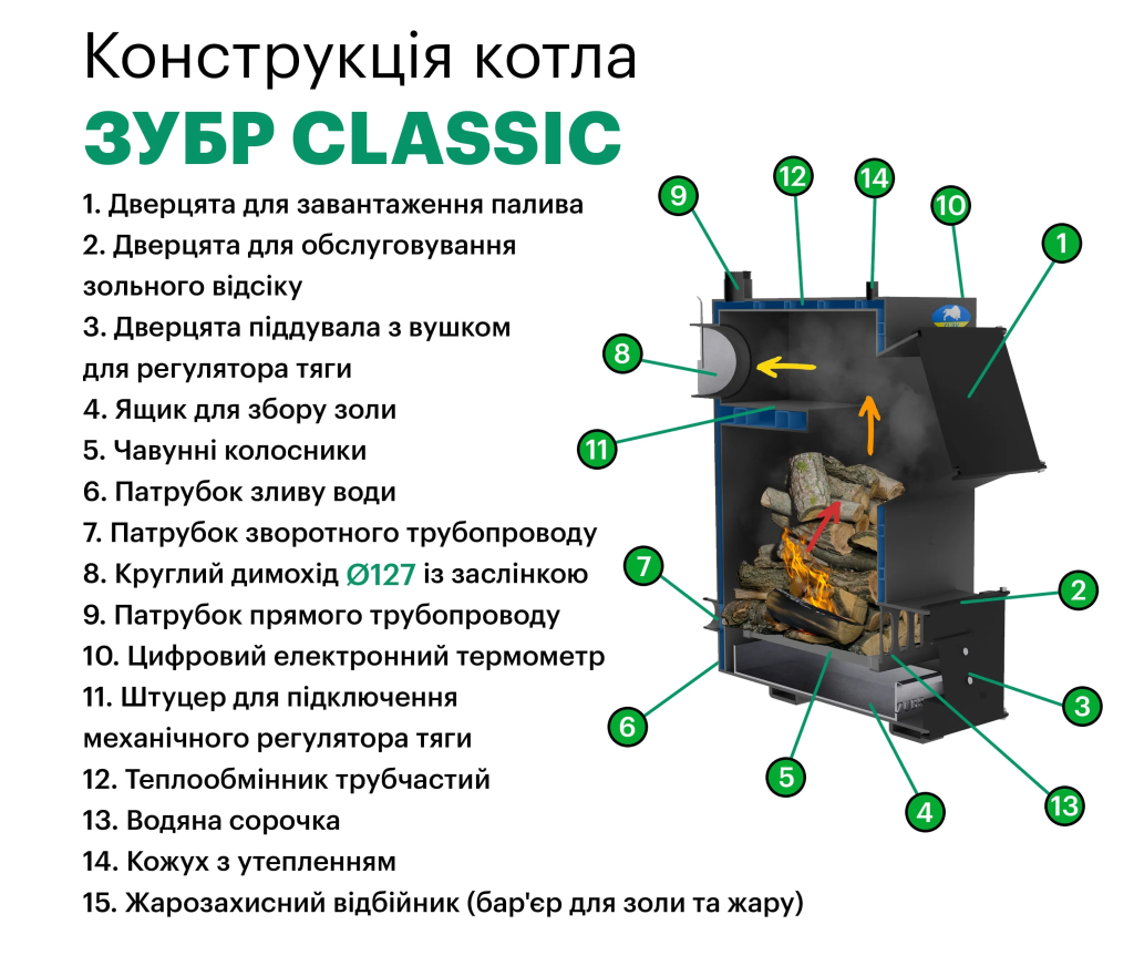 Надійні, економні та зручні в експлуатації котли для опалення приватних будинків, виробничих і складських приміщень. Серія ZUBR CLASSIC поєднує в собі простоту конструкції та високу ефективність згоряння дров, вугілля та інших видів твердого палива.